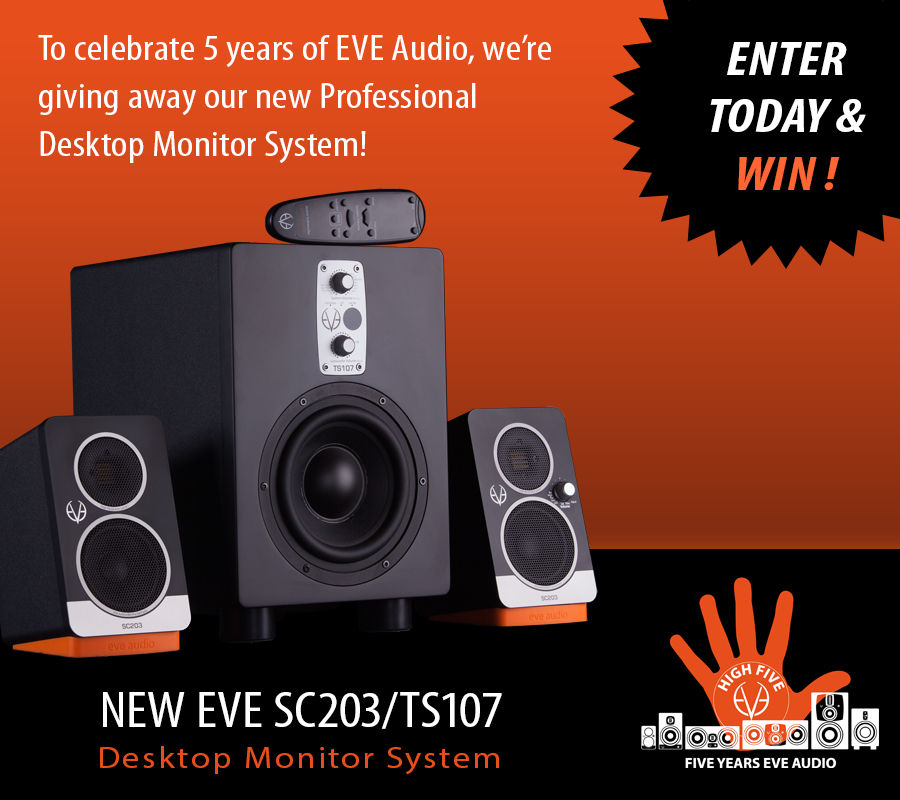 Ventura, CA – German studio monitor manufacturer EVE Audio turns five in May. To celebrate, they are giving away a desktop monitor system worth $1,568. The system includes a set of SC203 professional desktop monitors and a TS107 Thunderstorm subwoofer with remote control. Upon entering, participants can earn multiple bonus entries to increase their chance of winning by referring friends and posting on social media.